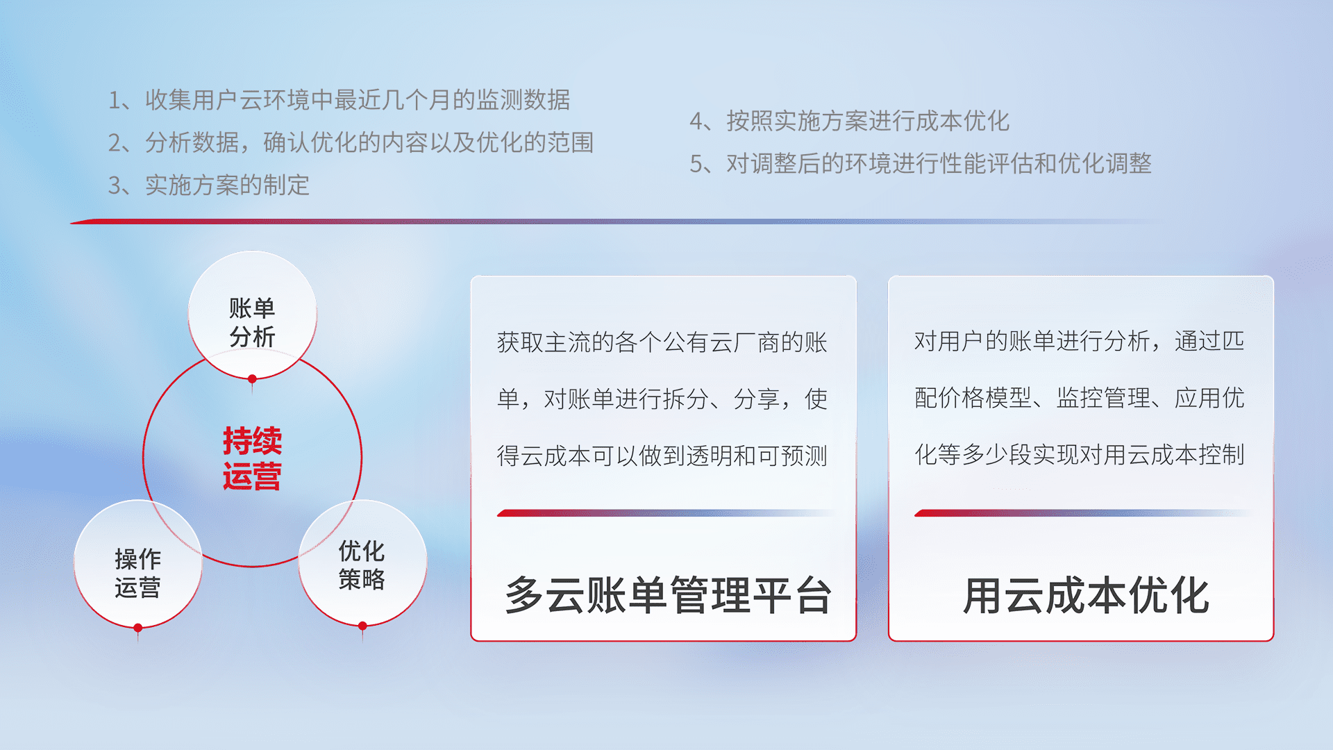 通过多云纳管,,,,以统一的资源数据模型把客户的云资源进行抽象和封装,,,进而实现对多云资源的统一操作,,保障云资源管理的可靠性、、、、稳定性与可用性。。。量身定制化运维内容,,,,配置、、、、开发运维、、补丁管理、、、备份、、、监控、、、、认证和访问管理、、、、审计和日常巡检等,,保障在用云过程中的可靠度,,,,稳定度以及高可用率。。。。