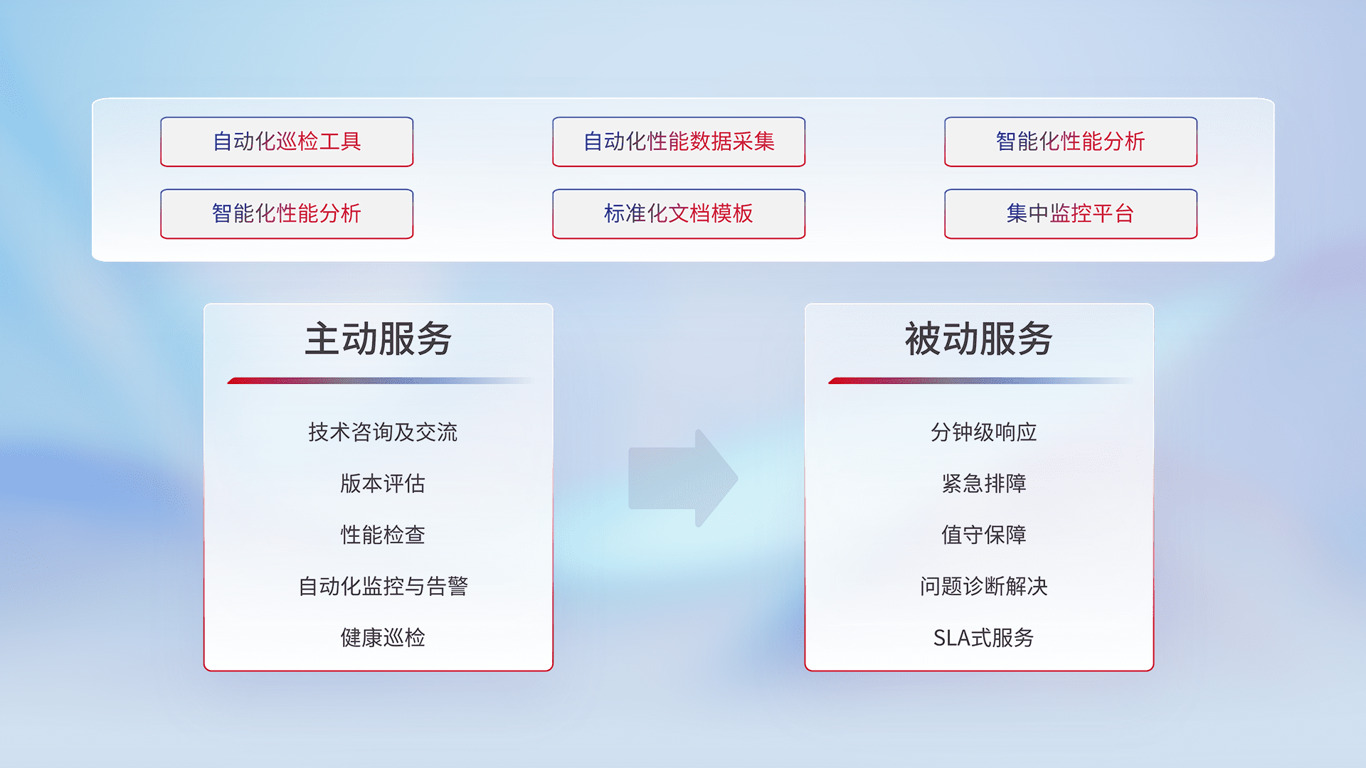 智能化工具和标准化文档,,,,保障服务质量,,提供主动服务(包含技术咨询、、版本评估、、、性能检查、、自动化监控与告警、、、、健康巡检)和被动服务包含(分钟级响应、、紧急排障、、值守保障、、问题诊断解决、、、、SLA服务)。。。