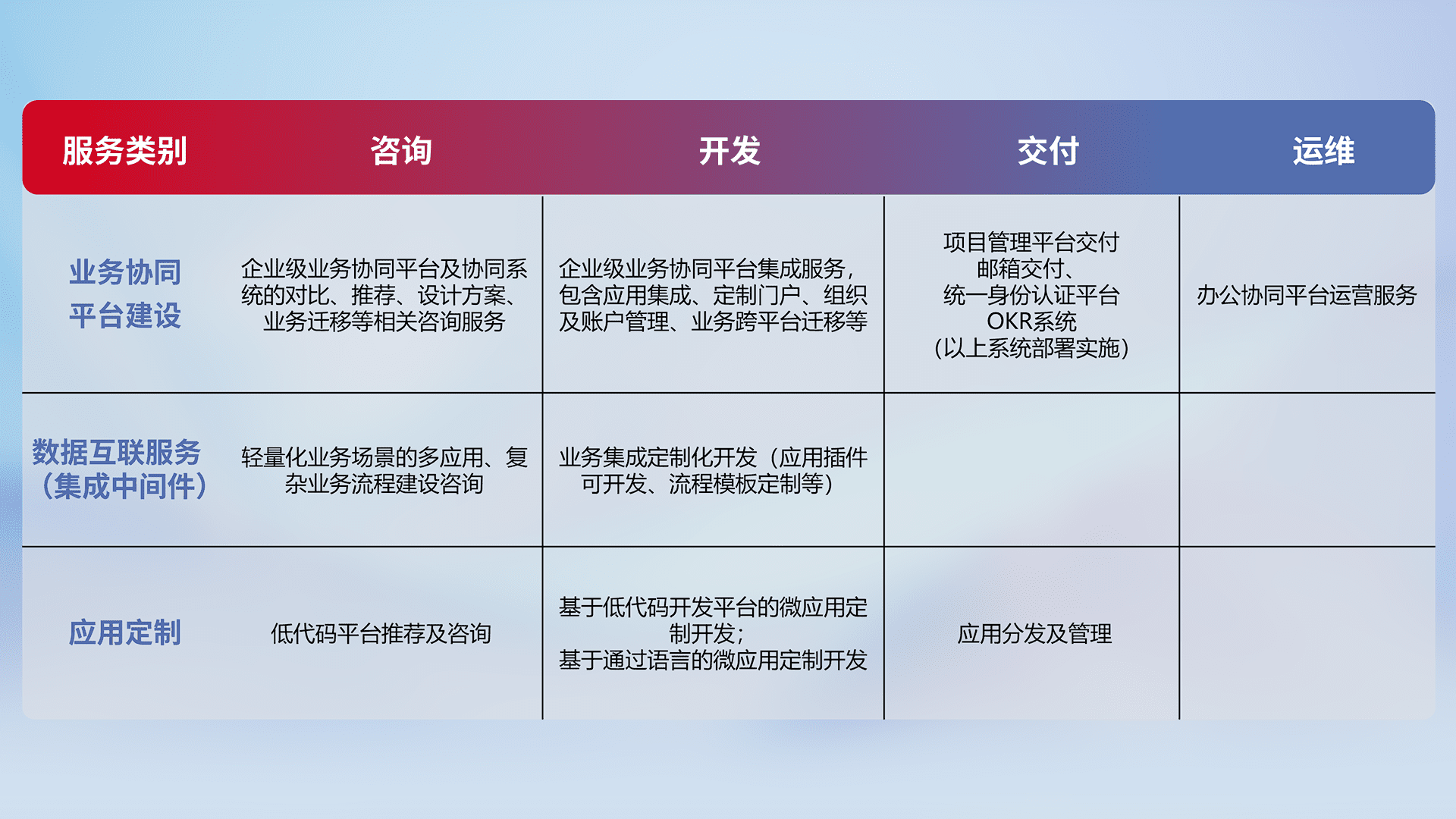 针对钉钉、、企微、、、IDaas等平台级产品提供产品的规划、、方案、、交付、、、定制化开发等服务,,实现如统一协同办公、、、智能客户服务、、、混合会议管理、、、、智能数据查询、、、、等业务场景,,实现数字化转型。。